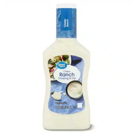 Aderezo Ranch de Great Value: cremoso, lleno de sabor con hierbas, especias y un toque de ajo. Botella de 473 ml para realzar ensaladas y snacks. ¡Añade un toque delicioso a tus comidas con este aderezo de Great Value!