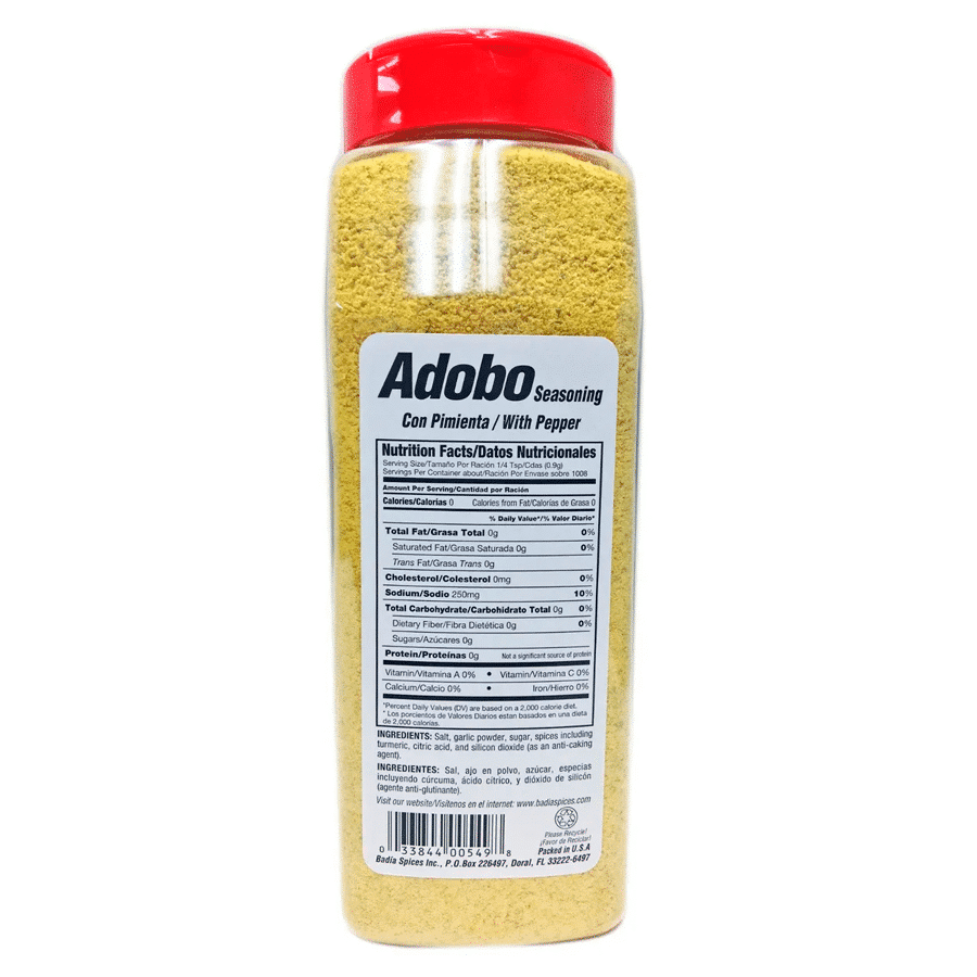 Adobo con Pimienta Badia 907,2 gr: Adobo sazonador con pimienta de la marca Badia, en envase de 907,2 gr. Mejora el sabor de tus comidas.