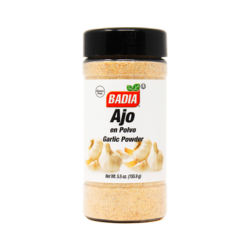 Ajo en Polvo Badia 5.5Oz/155.9g: Envase de ajo en polvo Badia con contenido de 155.9g.