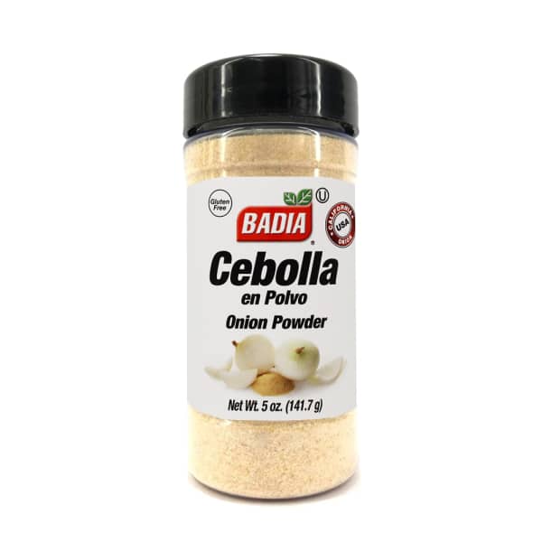 Cebolla en Polvo Badia 141.7g: Envase de cebolla en polvo Badia con contenido de 141.7g.