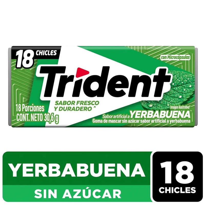 Chicle Trident Yerbabuena sin azúcar, en presentación individual. Ofrece un sabor fresco a menta que refresca el aliento de manera prolongada. Endulzado con xilitol, ayuda a limpiar los dientes y prevenir caries. Ideal para tener a mano en cualquier momento del día.