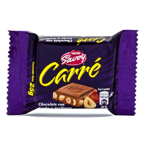 Disfruta del exquisito chocolate Carré de Nestlé con avellanas en su presentación de 25 gramos, perfecto para disfrutar como tentempié y satisfacer tus antojos en cualquier momento.