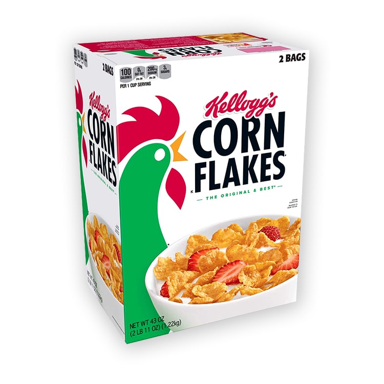 Este paquete contiene 2 bolsas de 1.22 kg de cereal Corn Flakes de la marca Kellogg’s. Es un cereal clásico hecho de copos de maíz tostados, ideal para un desayuno rápido y saludable.