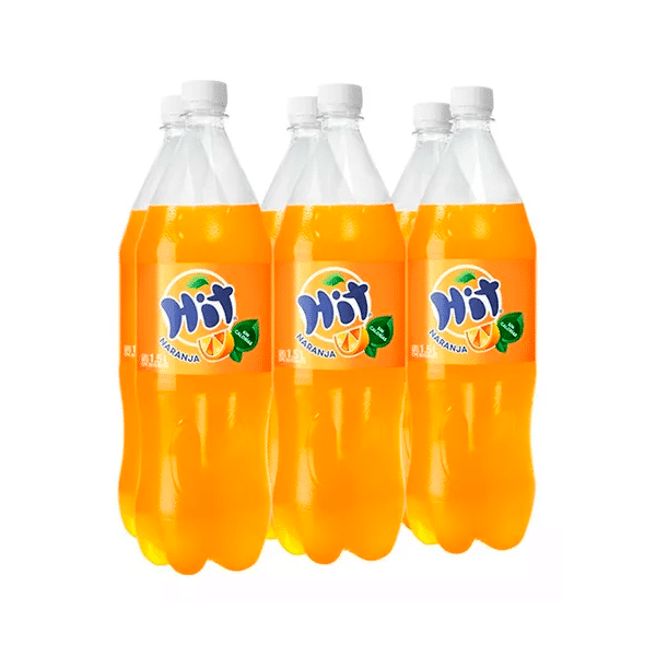 Hit Naranja 1,5 L x 6 Pack: Un paquete que contiene 6 botellas de 1,5 litros de refresco Hit sabor naranja. Perfecto para mantenerse fresco y disfrutar de su delicioso sabor.