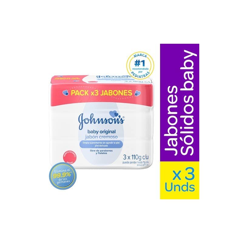 Jabón Johnson Baby Original 3 Unidades x 110 gr: Un pack que contiene tres jabones Johnson’s Baby originales de 110 gramos cada uno, suaves y delicados para el cuidado de la piel de tu bebé.