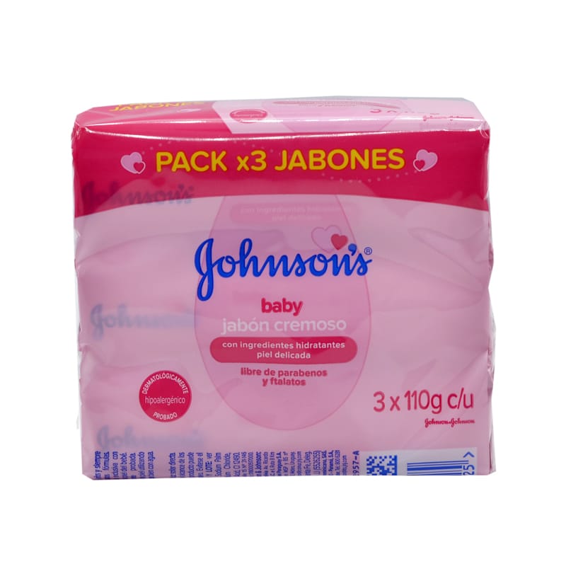 Jabón Johnson Humectante 3 Unidades de 110 gr: Un paquete con tres jabones Johnson’s que contienen 110 gramos cada uno, enriquecidos con humectantes para cuidar y suavizar la piel de tu bebé.