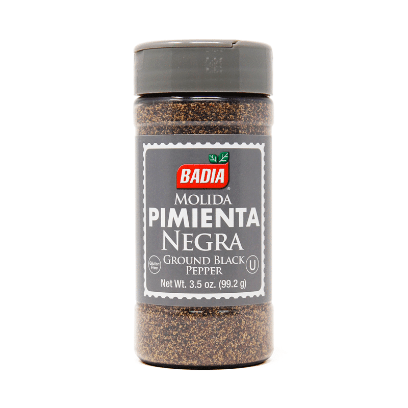 Pimienta Negra Molida Badia 3.5Oz/99.2g: Envase de pimienta negra molida Badia con contenido de 99.2g (3.5 onzas).