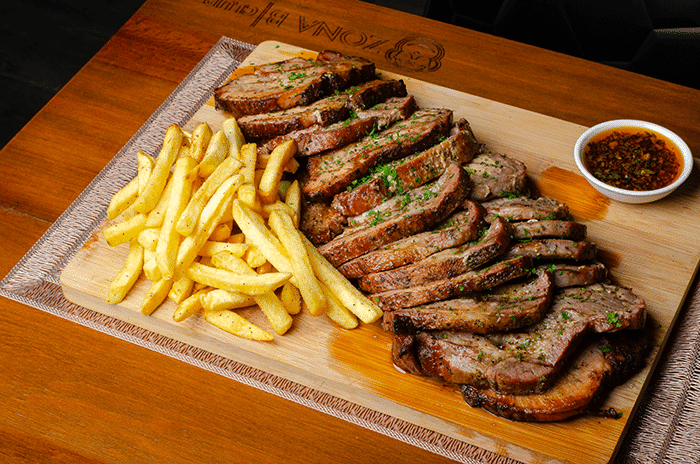 Ingredientes: Punta trasera Angus 1 kg, papas fritas 350 gr, queso mozzarella 6 triángulos.