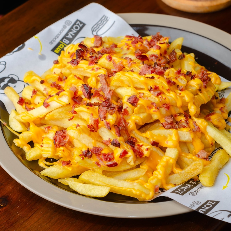 - Ingredientes: Papas fritas 300 gr, queso cheddar, trocitos de bacon.